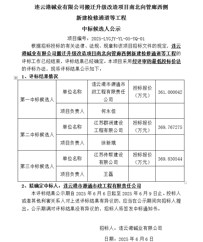 搬遷升級改造項目南北向管廊西側(cè)新建檢修通道等工程中標候選人公示