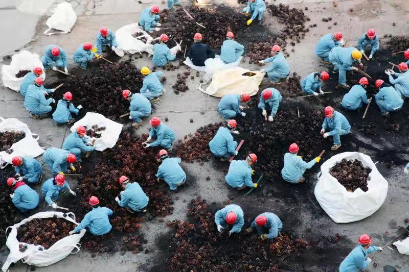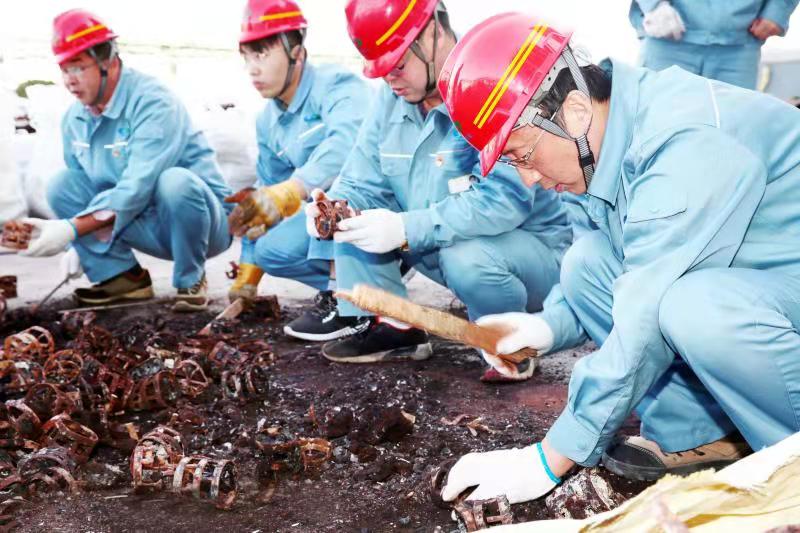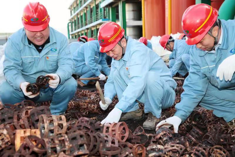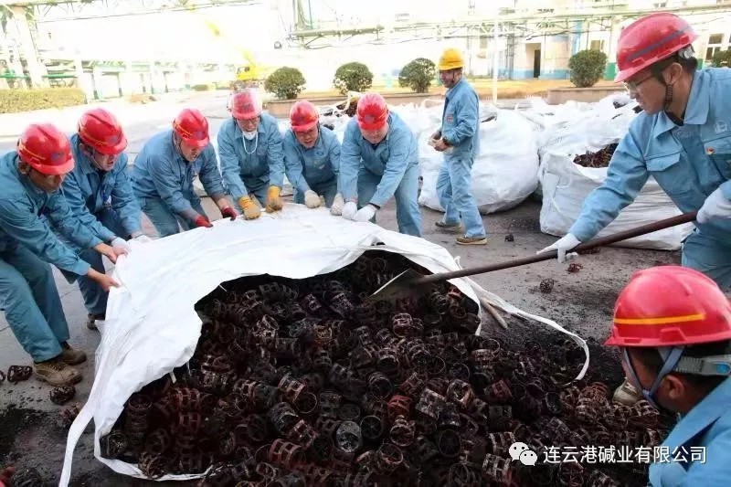 由于清理工作全靠人力完成,崗位人員一邊要維持生產(chǎn),一邊要清理填料,工作量非常大。11月12日下午,公司黨委書(shū)記、董事長(zhǎng)張衛(wèi)民在調(diào)研重堿車間生產(chǎn)現(xiàn)場(chǎng)時(shí)了解到這一情況后,當(dāng)機(jī)立斷,立即組織公司領(lǐng)導(dǎo)及各部門黨員干部義務(wù)勞動(dòng),協(xié)助重堿車間完成鮑爾環(huán)填料清理回收工作。