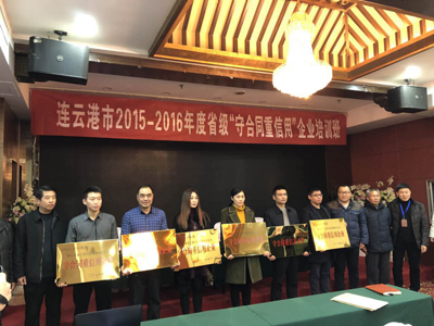 12月11日下午,連云港市2015-2016年度省級“守合同重信用”企業(yè)培訓(xùn)班在明珠大酒店舉行,會議進(jìn)行了授牌儀式,我公司榮獲省級“守合同重信用”單位。