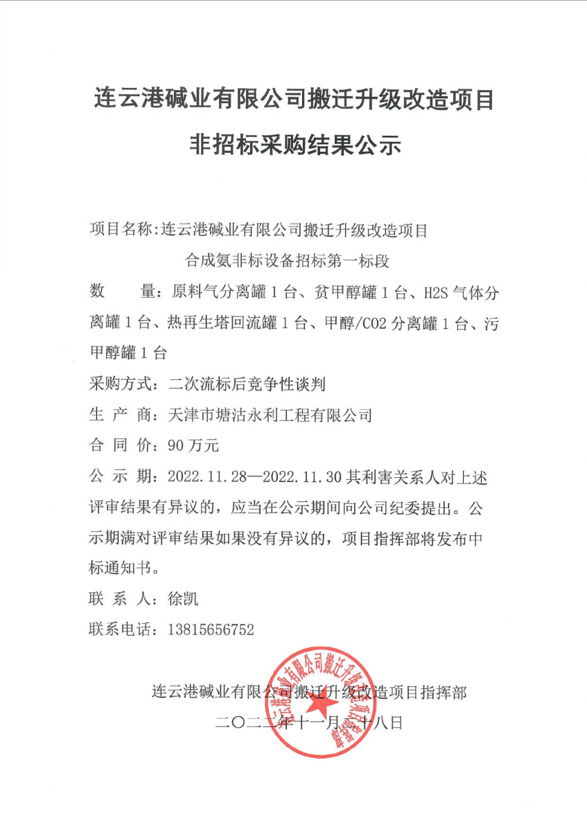 合成氨非標設(shè)備招標第一標段非標采購結(jié)果公示