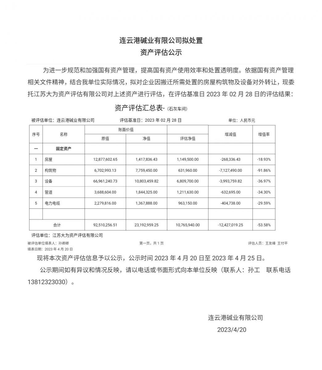 石灰車(chē)間資產(chǎn)評(píng)估公示