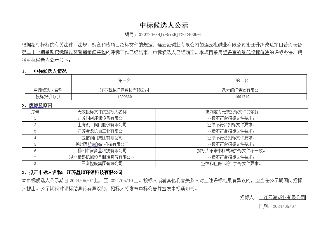 搬遷升級(jí)改造項(xiàng)目普通設(shè)備第二十七期采購(gòu)招標(biāo)聯(lián)堿裝置插板閥采購(gòu)中標(biāo)候選人公示